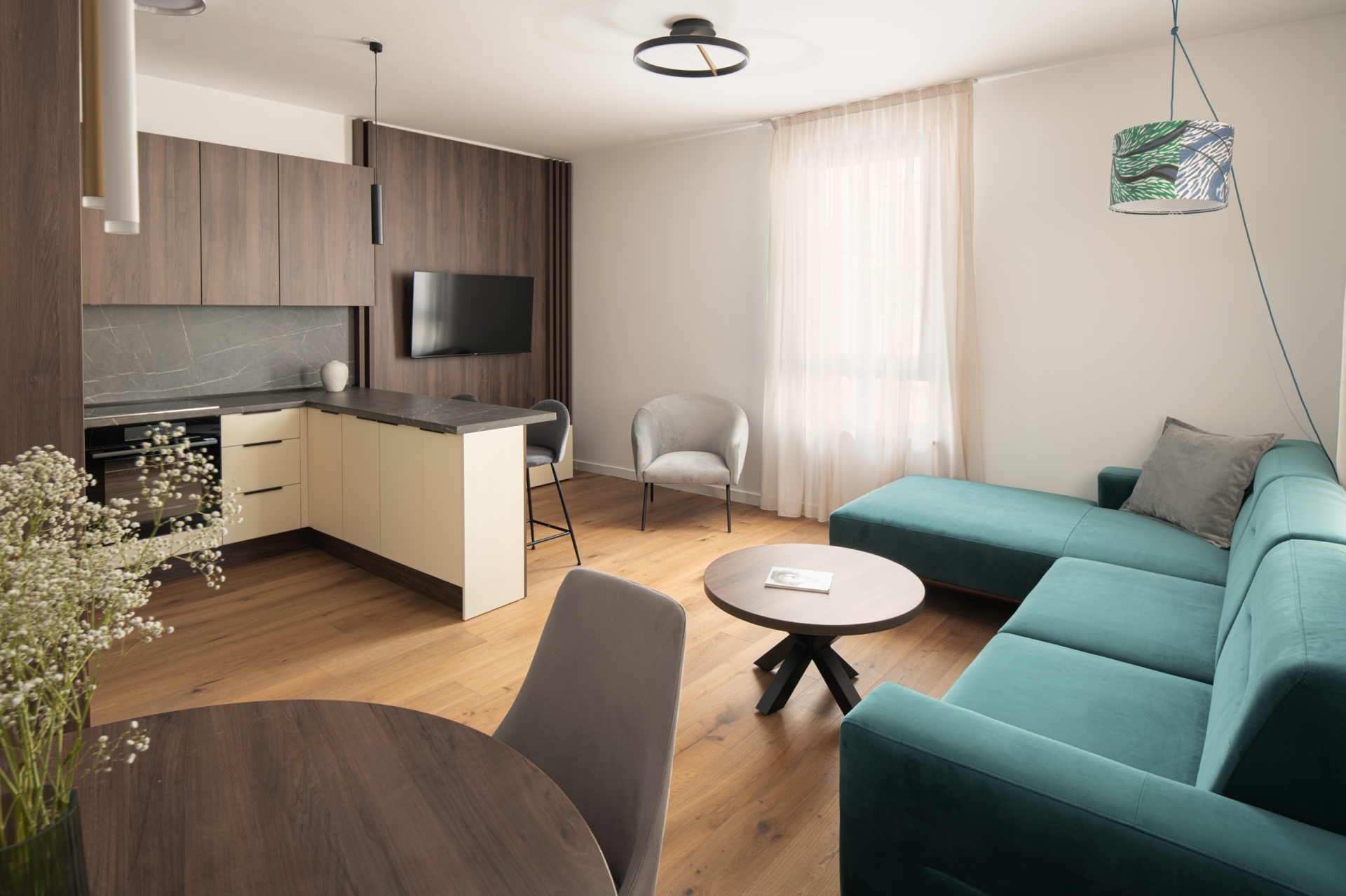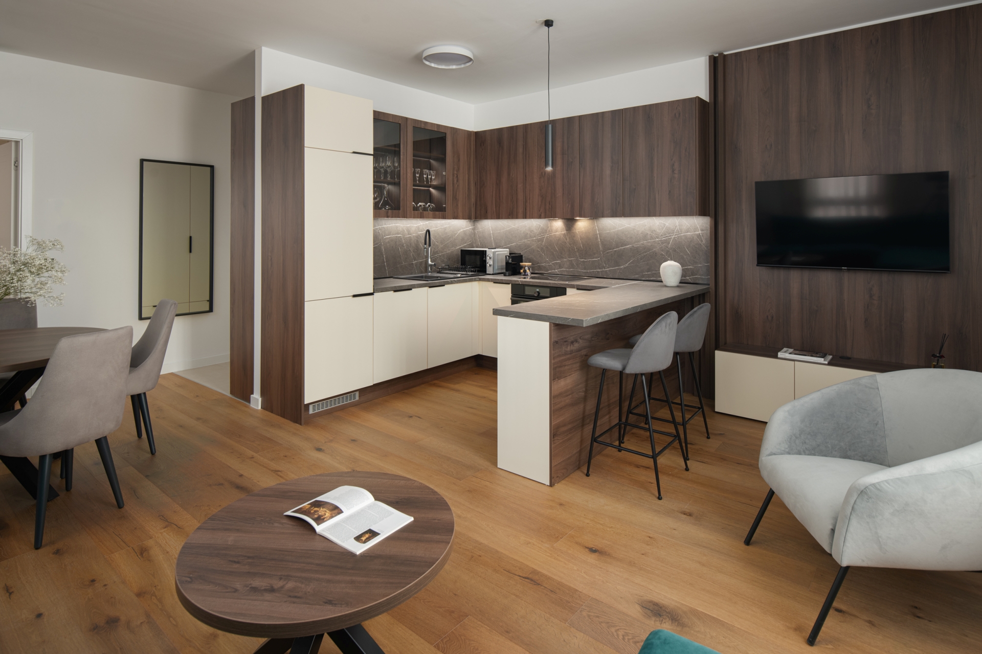 Apartman uključuje prostrani dnevni boravak, moderno opremljenu kuhinju i blagovaonicu, udobnu spavaću sobu, te elegantnu kupaonicu s walk-in tušem.