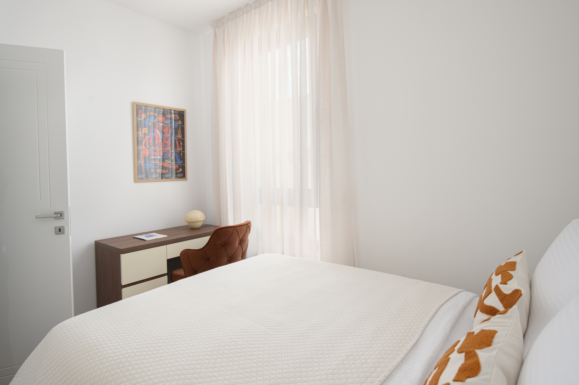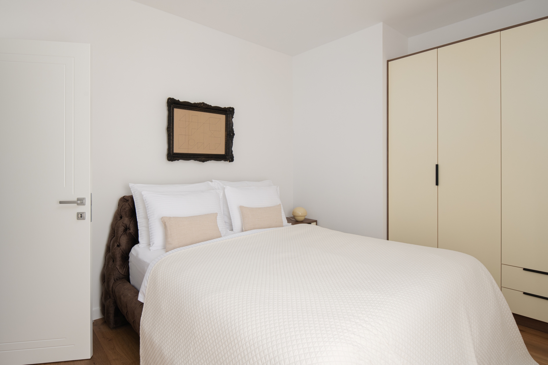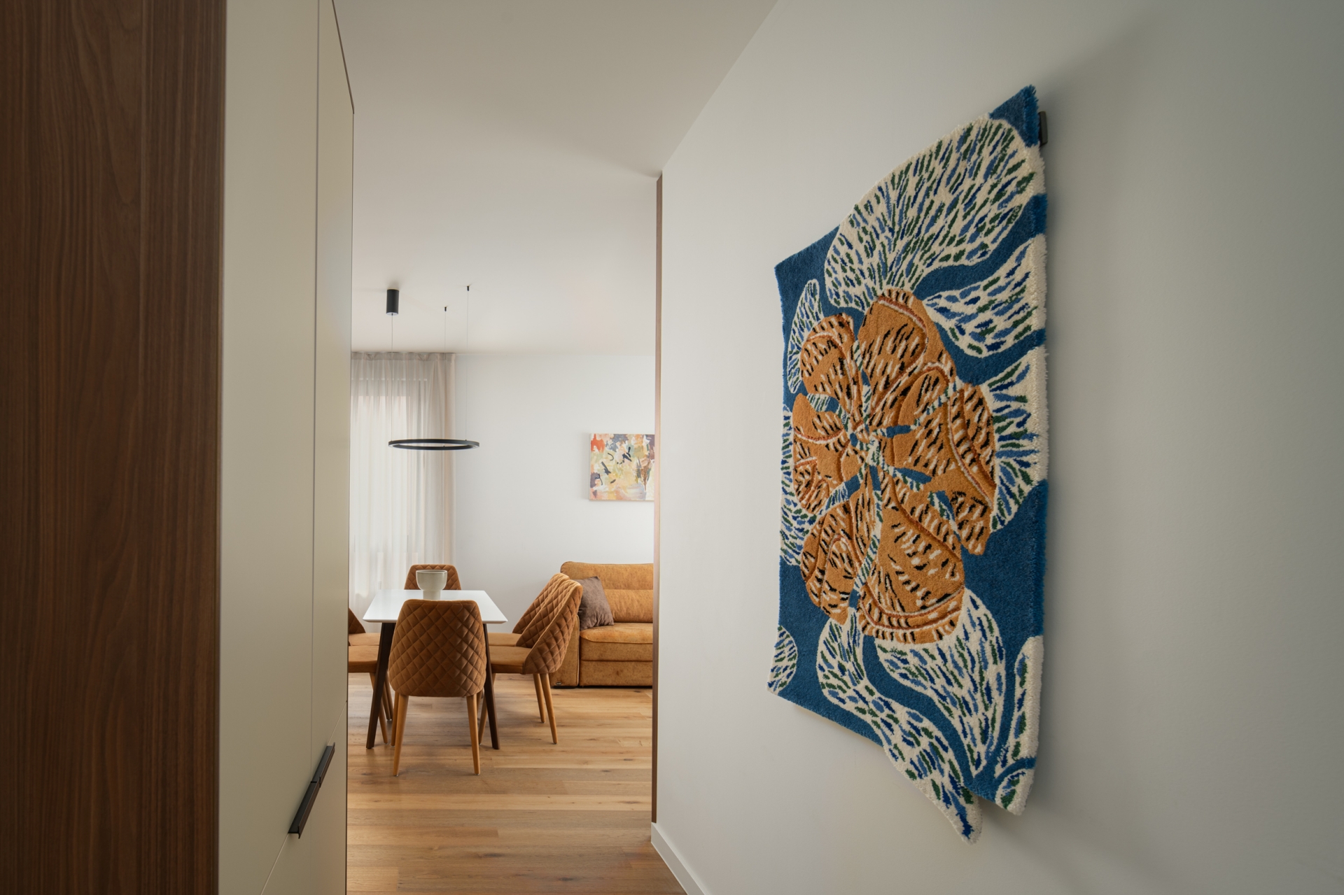 Ovaj moderni apartman s dvije spavaće sobe predstavlja savršen spoj estetike, udobnosti i suvremenog života. Prostor je pažljivo osmišljen kako bi nadahnuo, ne samo svojim dizajnom i promišljenim detaljima, već i originalnim djelima hrvatskih umjetnika mlađe i srednje generacije, koji svakom kutku daju osobnost i karakter.