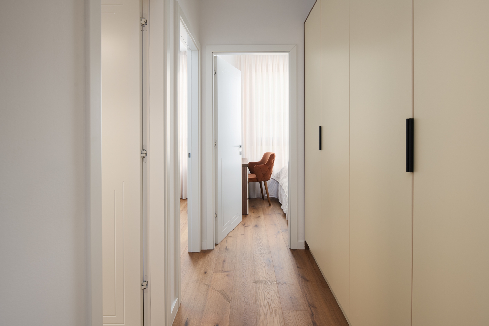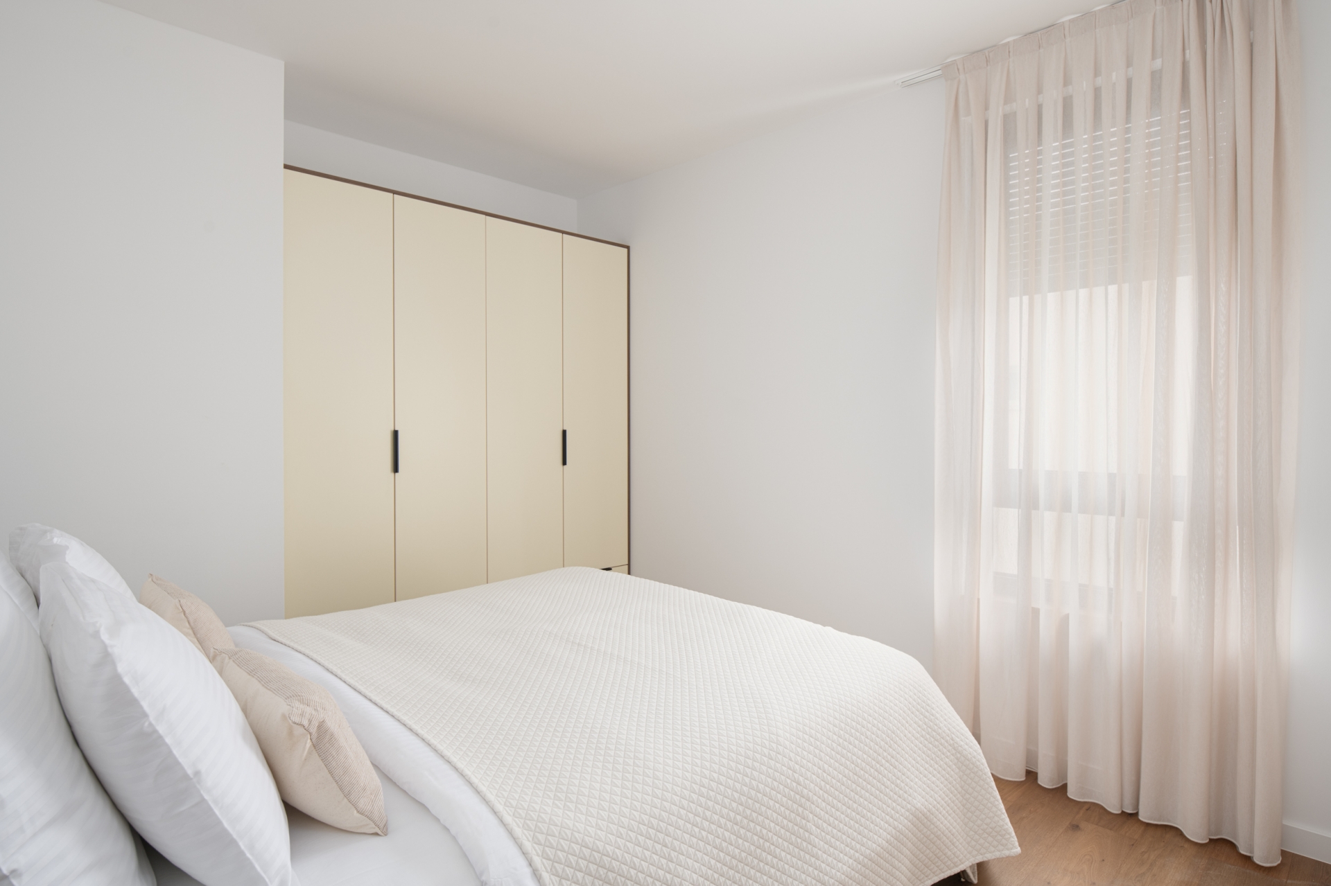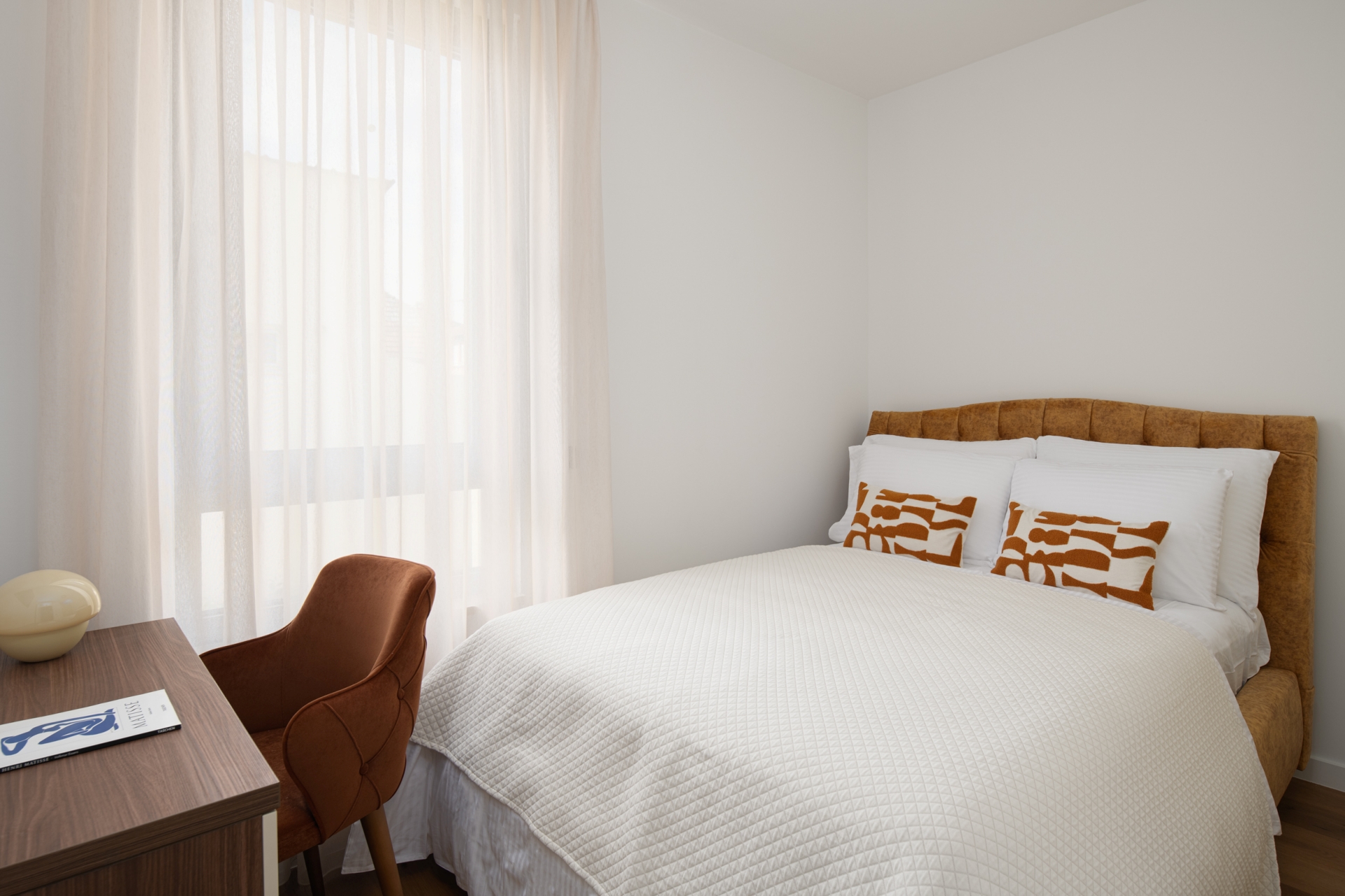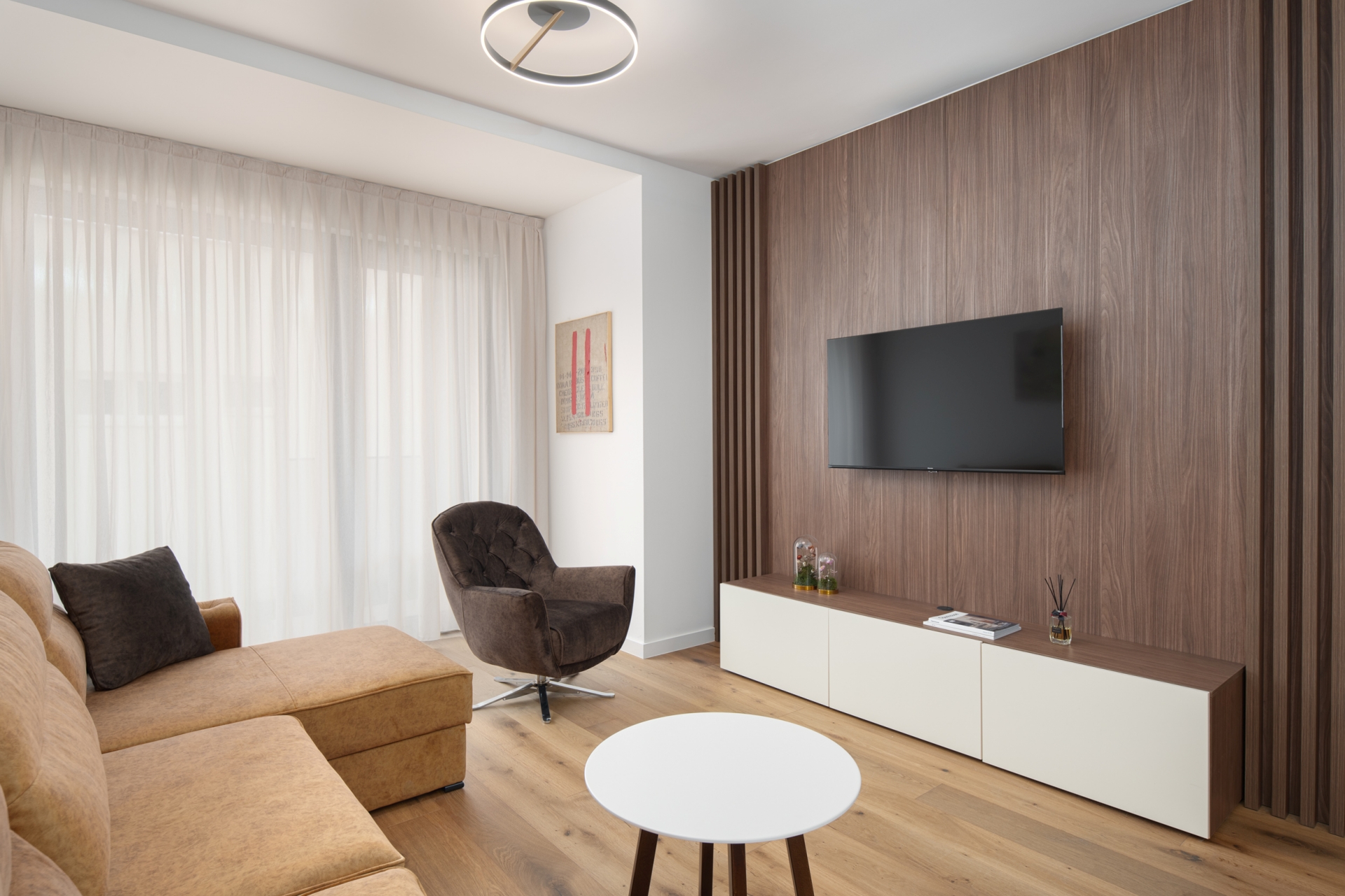 Ovaj moderni apartman s dvije spavaće sobe predstavlja savršen spoj estetike, udobnosti i suvremenog života. Prostor je pažljivo osmišljen kako bi nadahnuo, ne samo svojim dizajnom i promišljenim detaljima, već i originalnim djelima hrvatskih umjetnika mlađe i srednje generacije, koji svakom kutku daju osobnost i karakter.