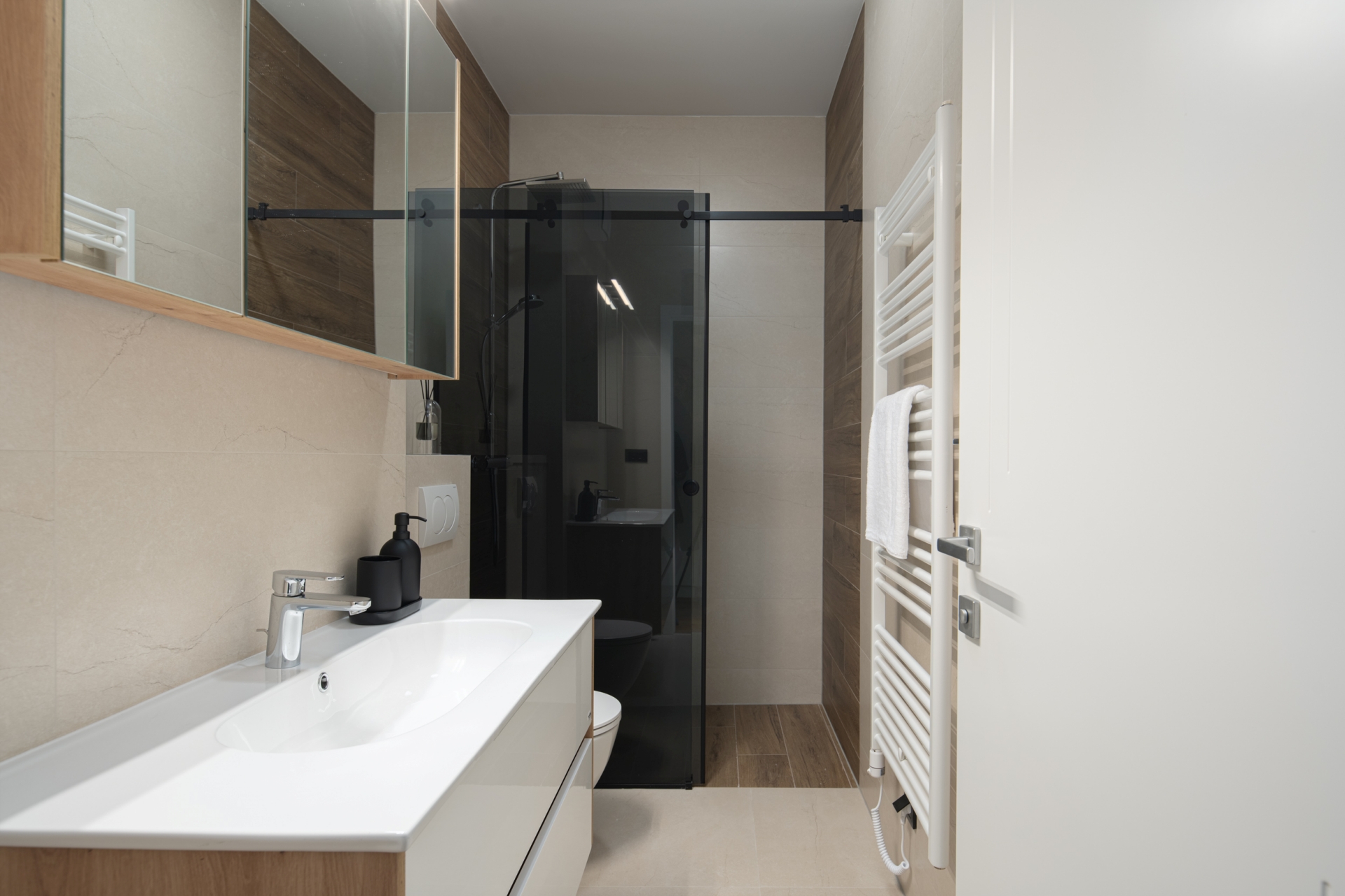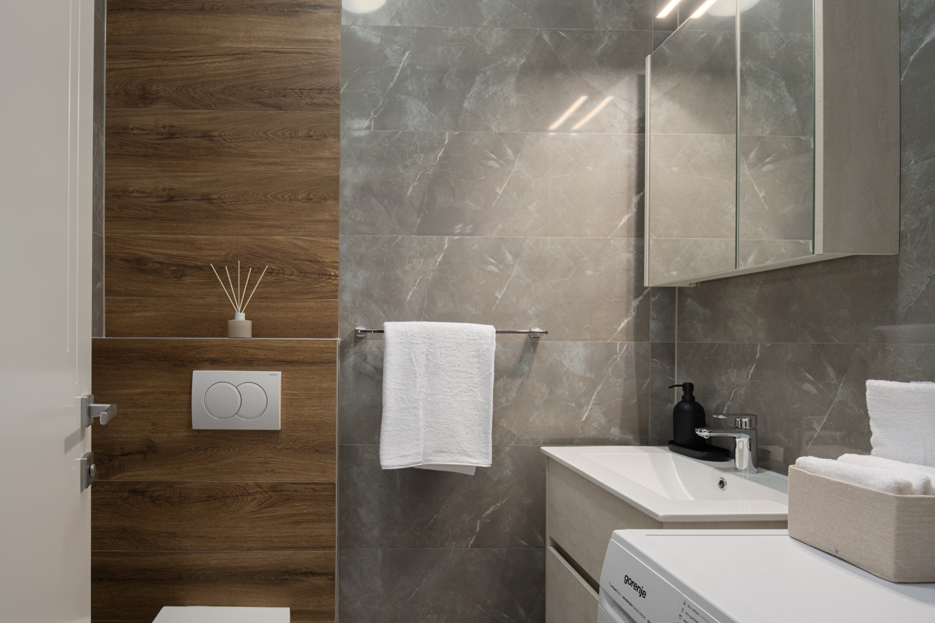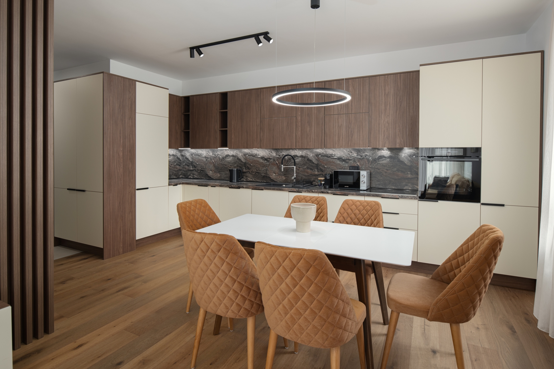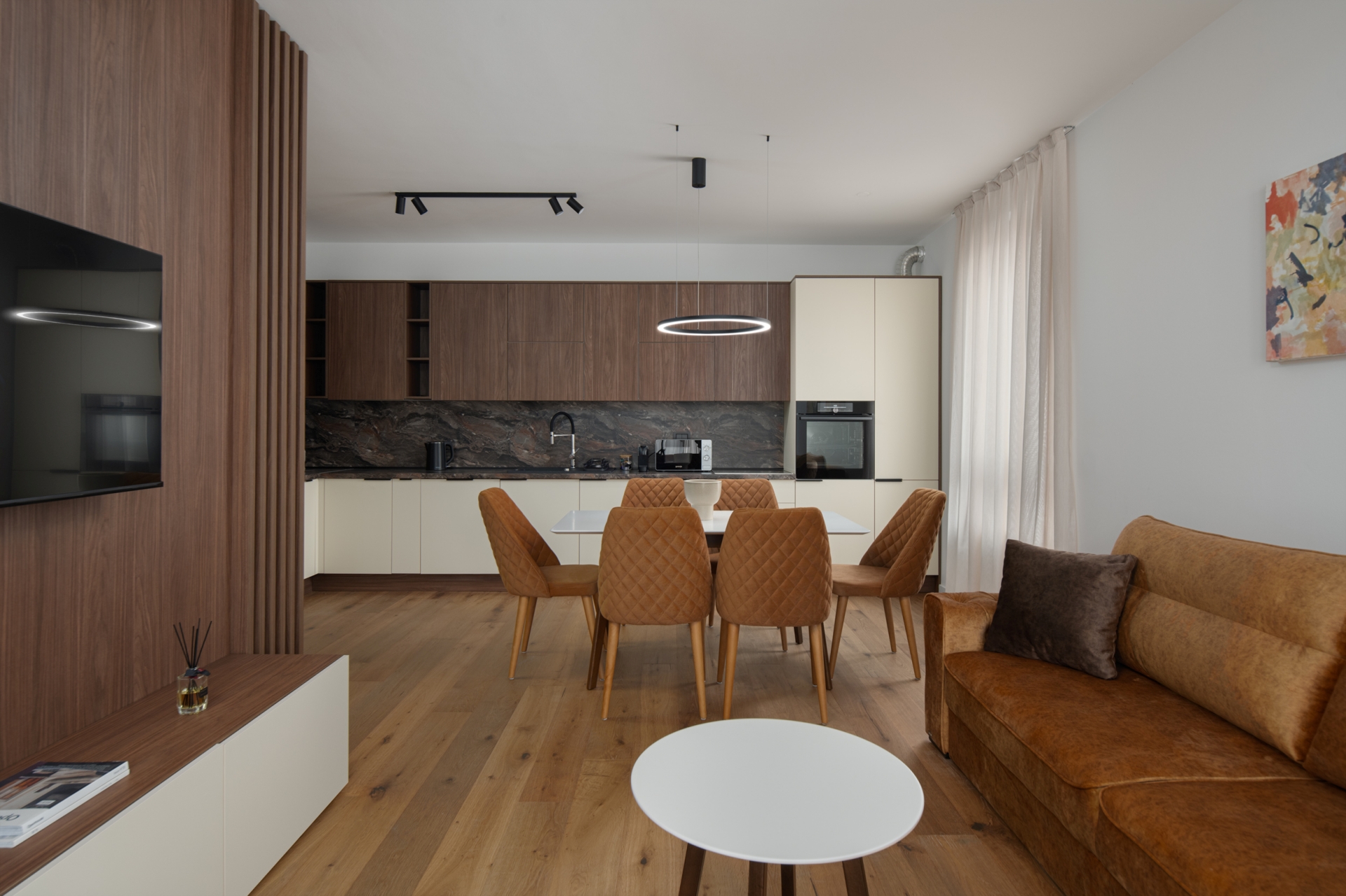 Apartman uključuje prostrani dnevni boravak, moderno opremljenu kuhinju s blagovaonicom, dvije udobne spavaće sobe, elegantnu kupaonicu s walk-in tušem te dodatni WC.