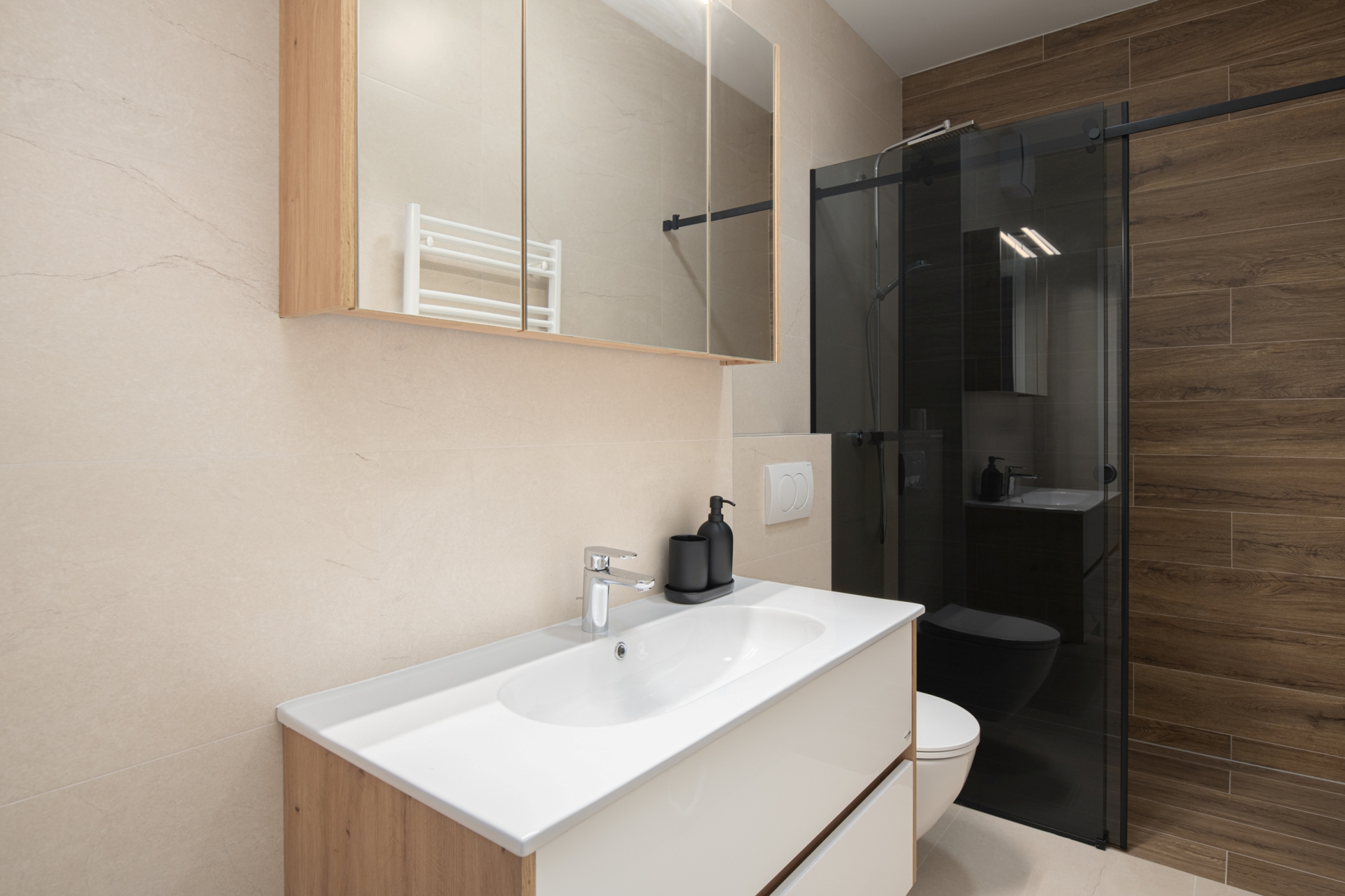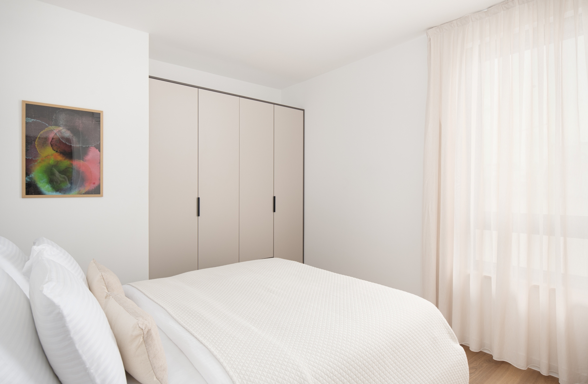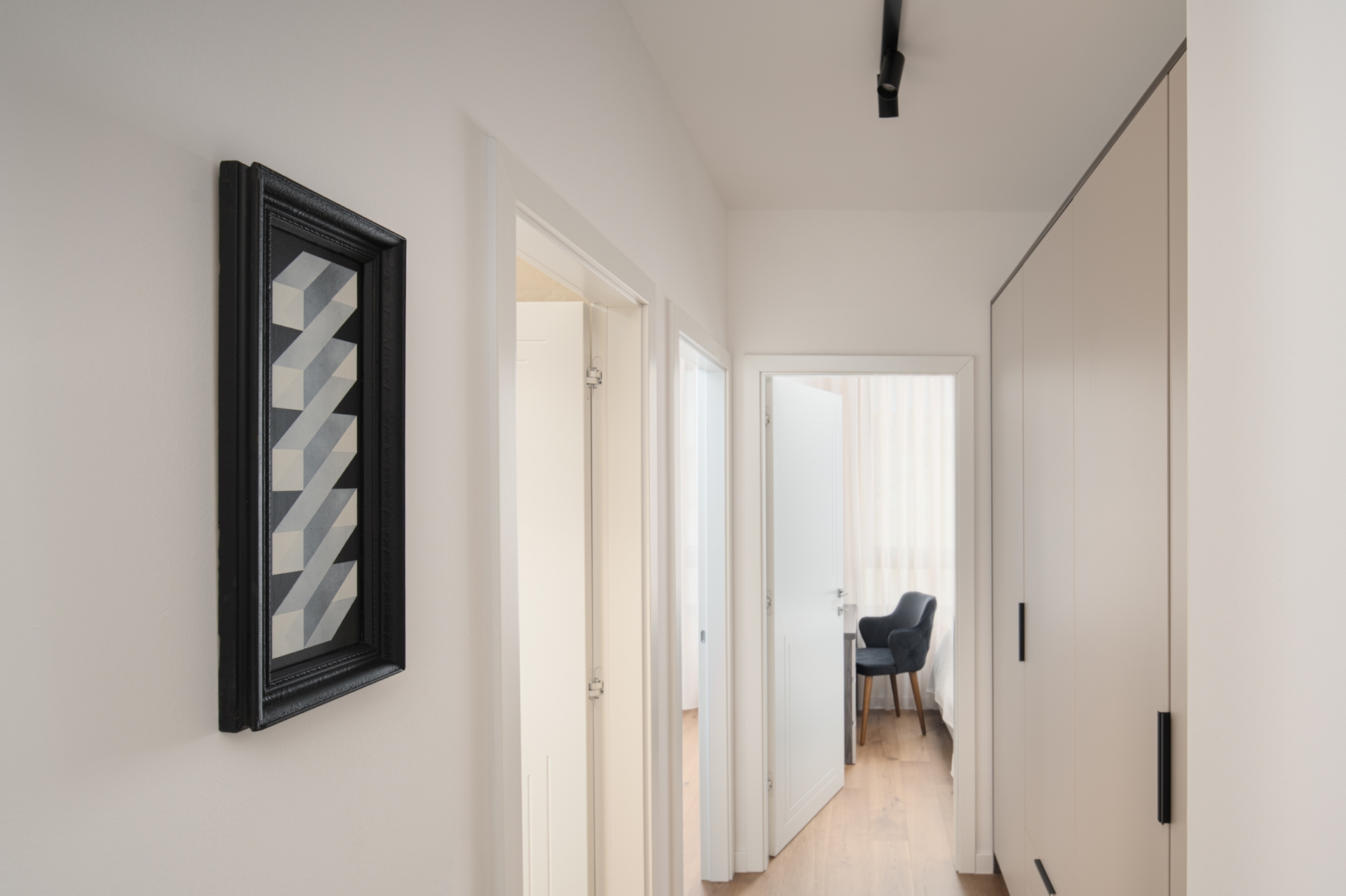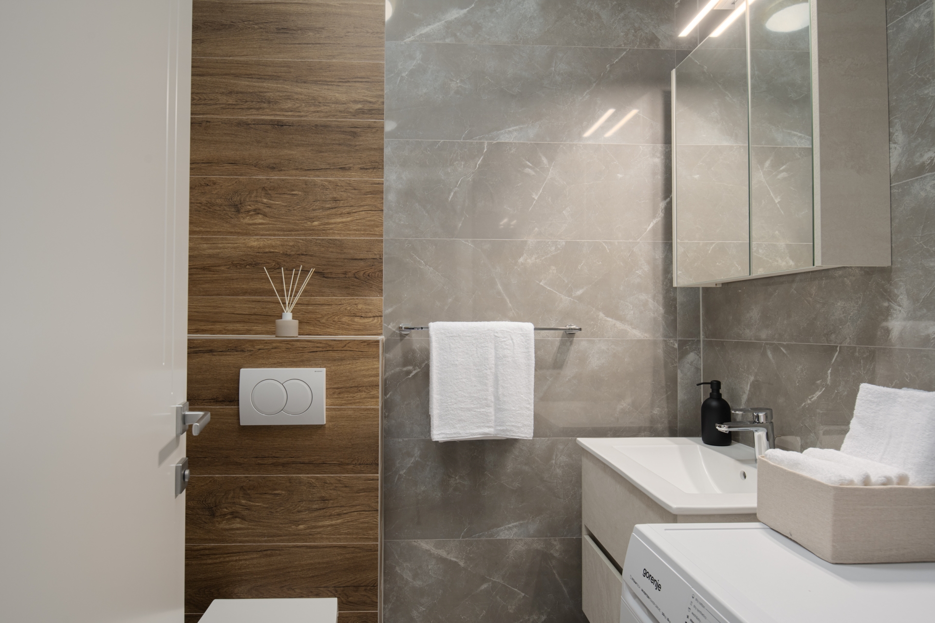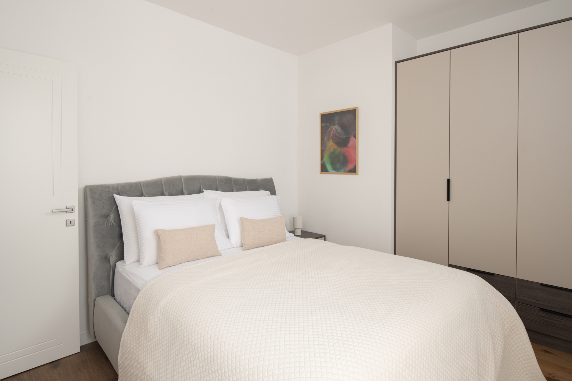 Apartman uključuje dvije udobne i moderno uređene spavaće sobe, prostrani dnevni boravak s blagovaonicom, potpuno opremljenu kuhinju, elegantnu kupaonicu s walk-in tušem, dodatni WC te balkon koji pruža prirodnu svjetlost i prostor za opuštanje.