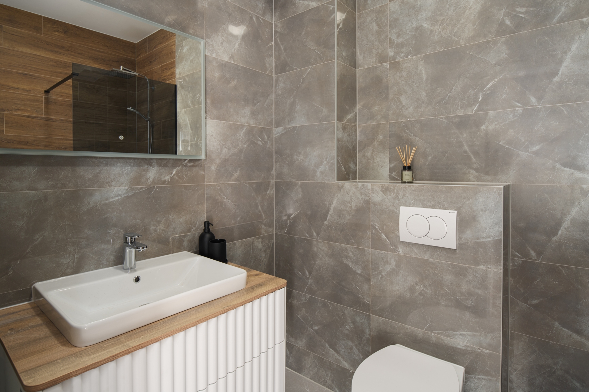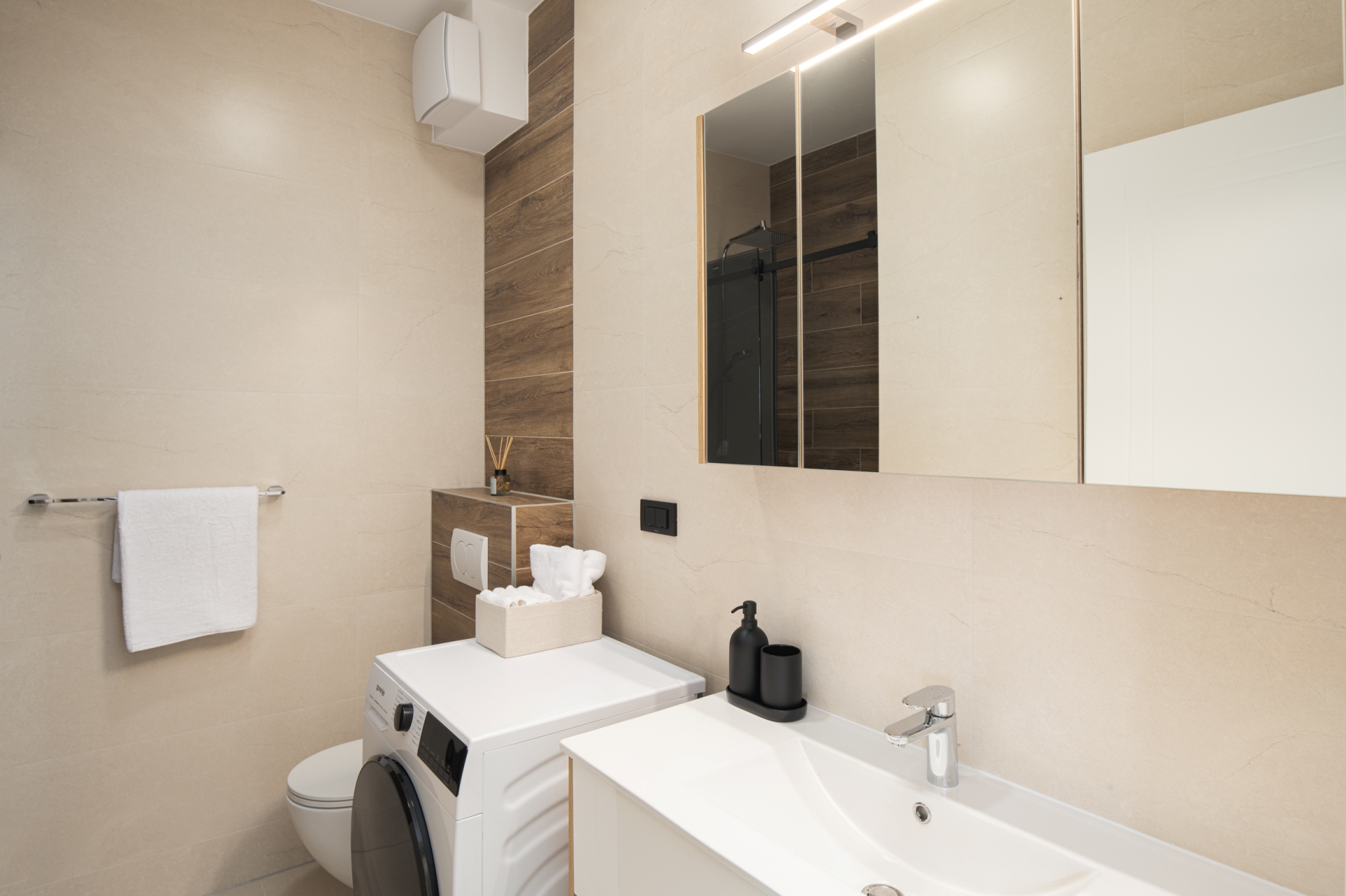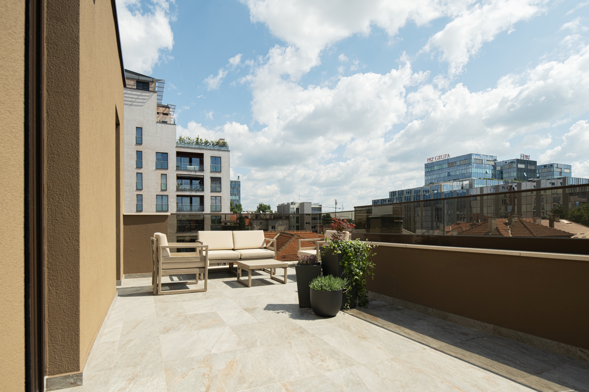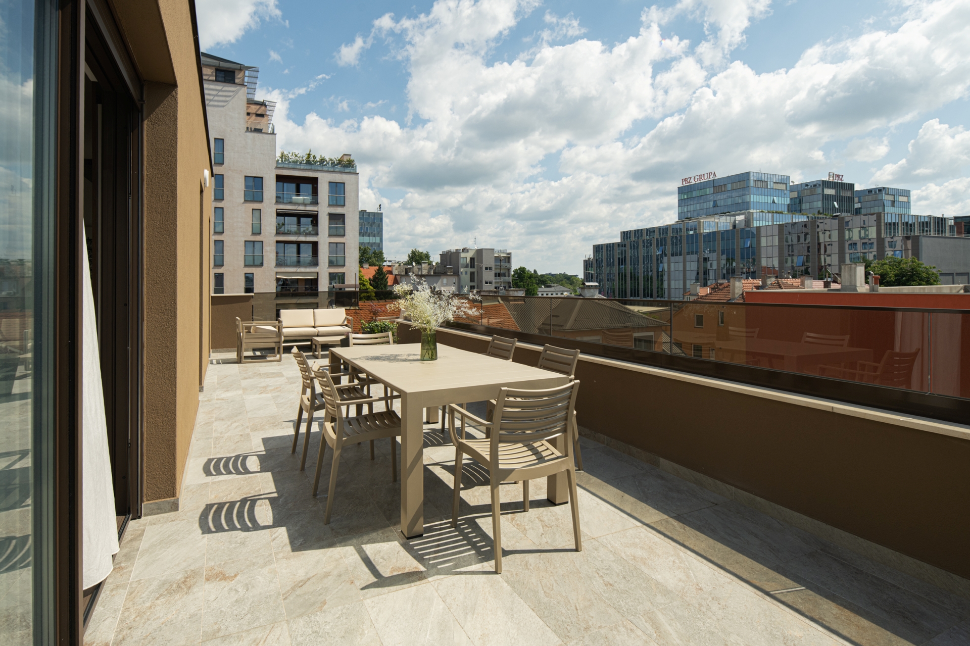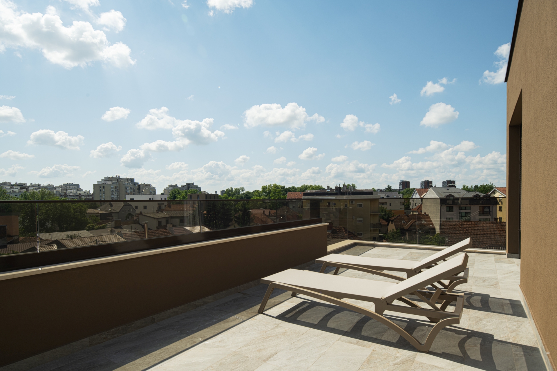Apartman uključuje tri moderno uređene spavaće sobe od kojih je jedna master bedroom s vlastitom kupaonicom, prostrani dnevni boravak s blagovaonicom, potpuno opremljenu kuhinju, dvije kupaonice s walk-in tušem, dodatni WC te velikom terasom s pogledom na grad idealnom za opuštanje i druženje.