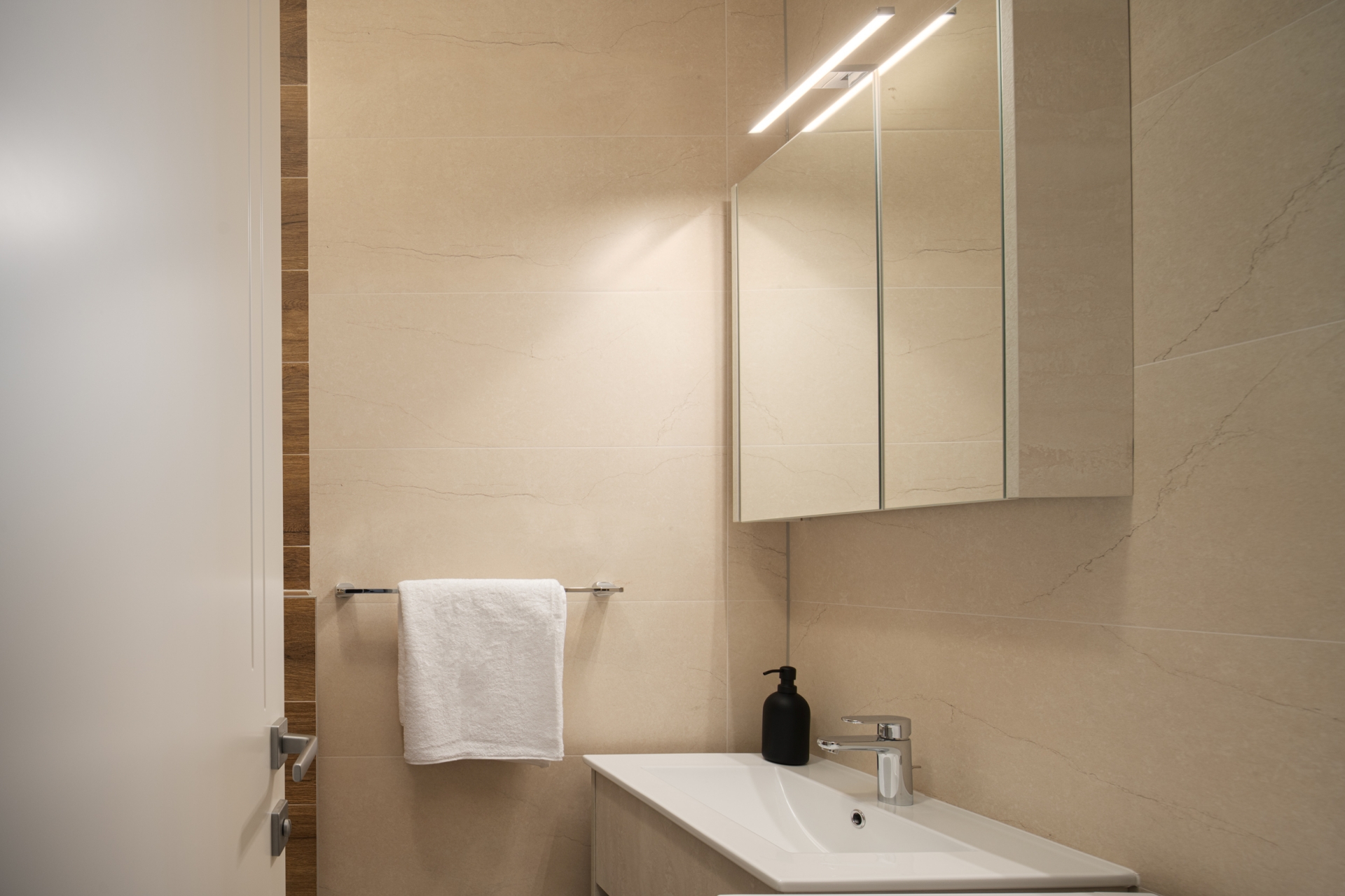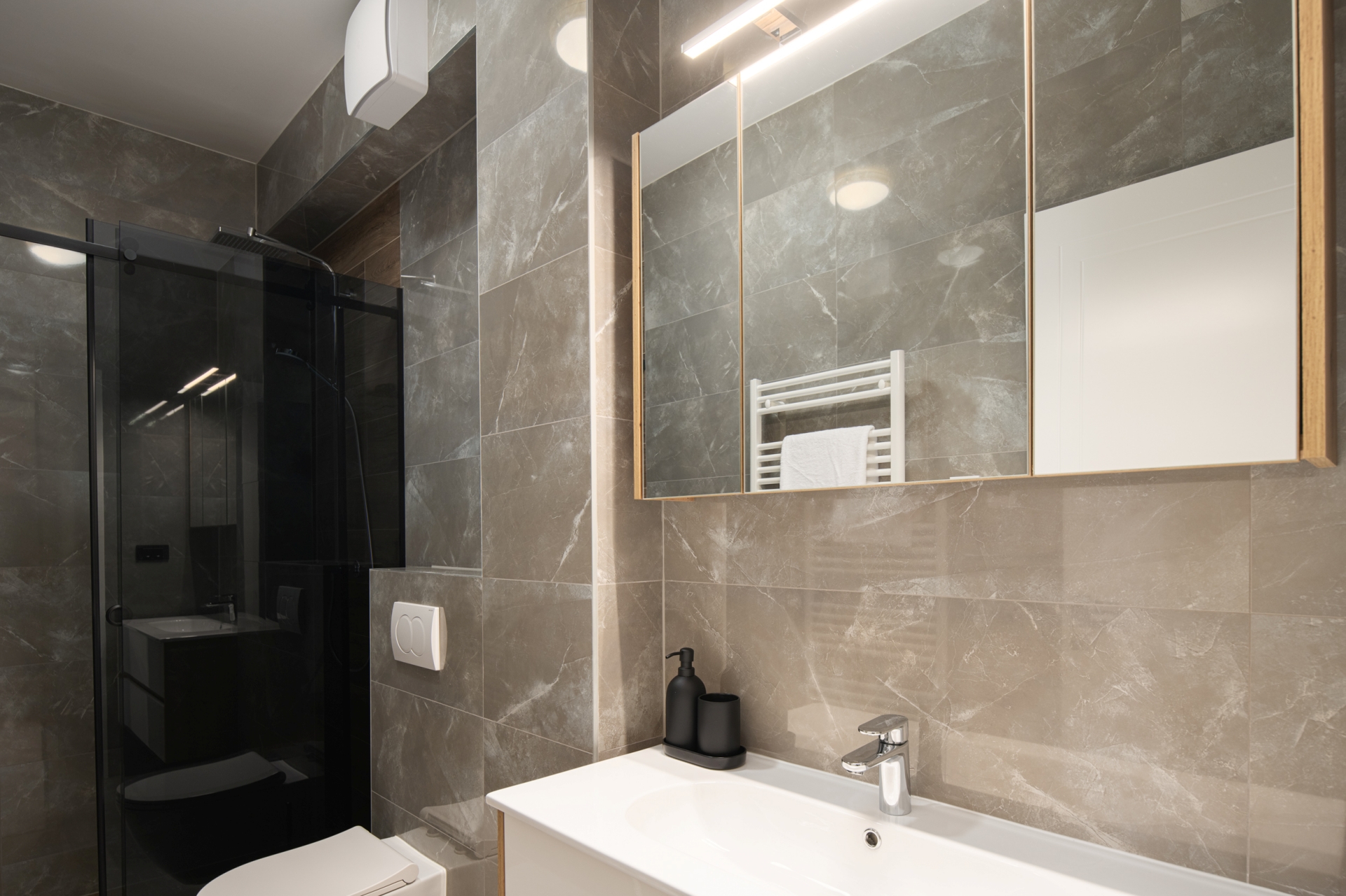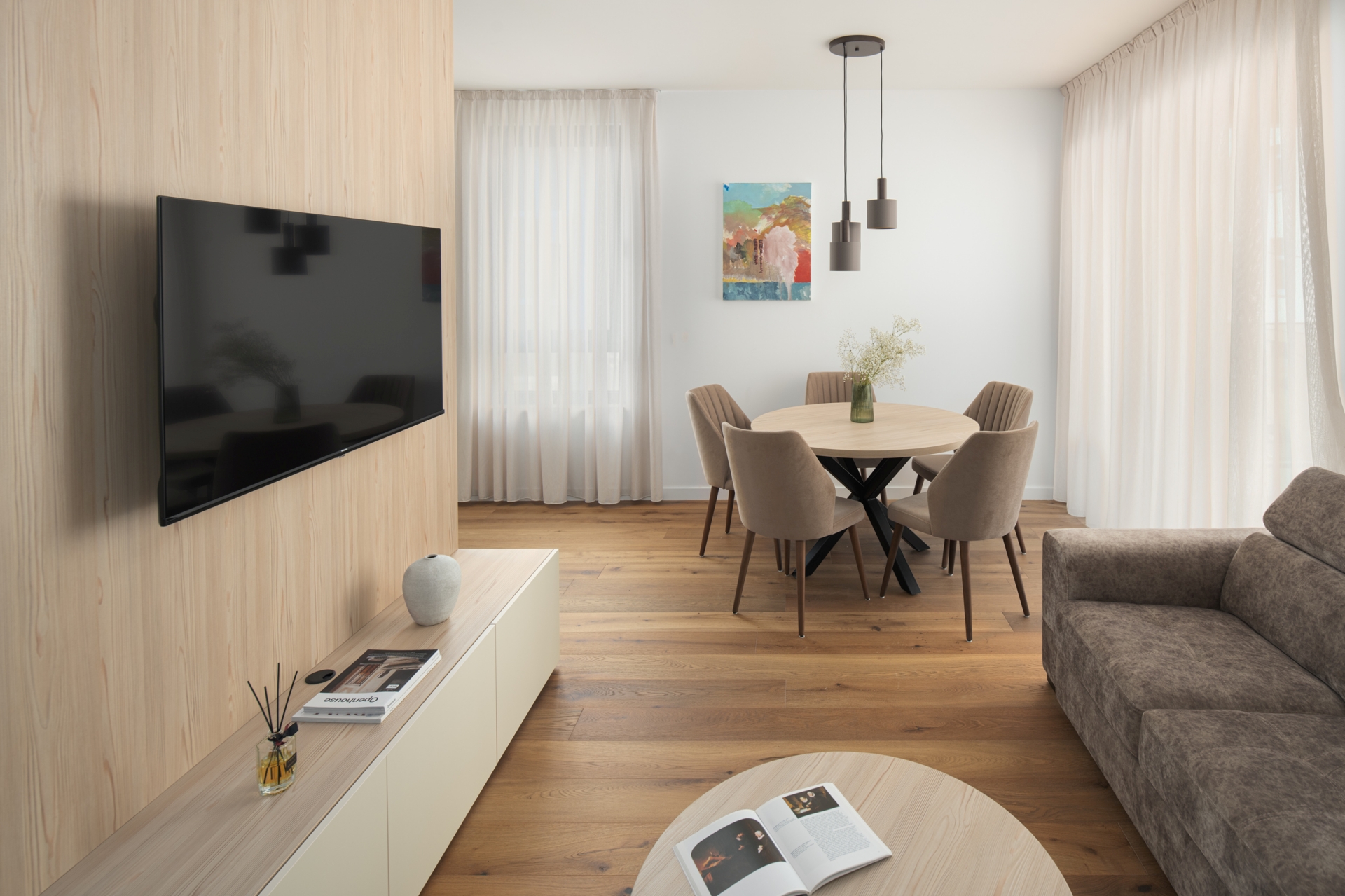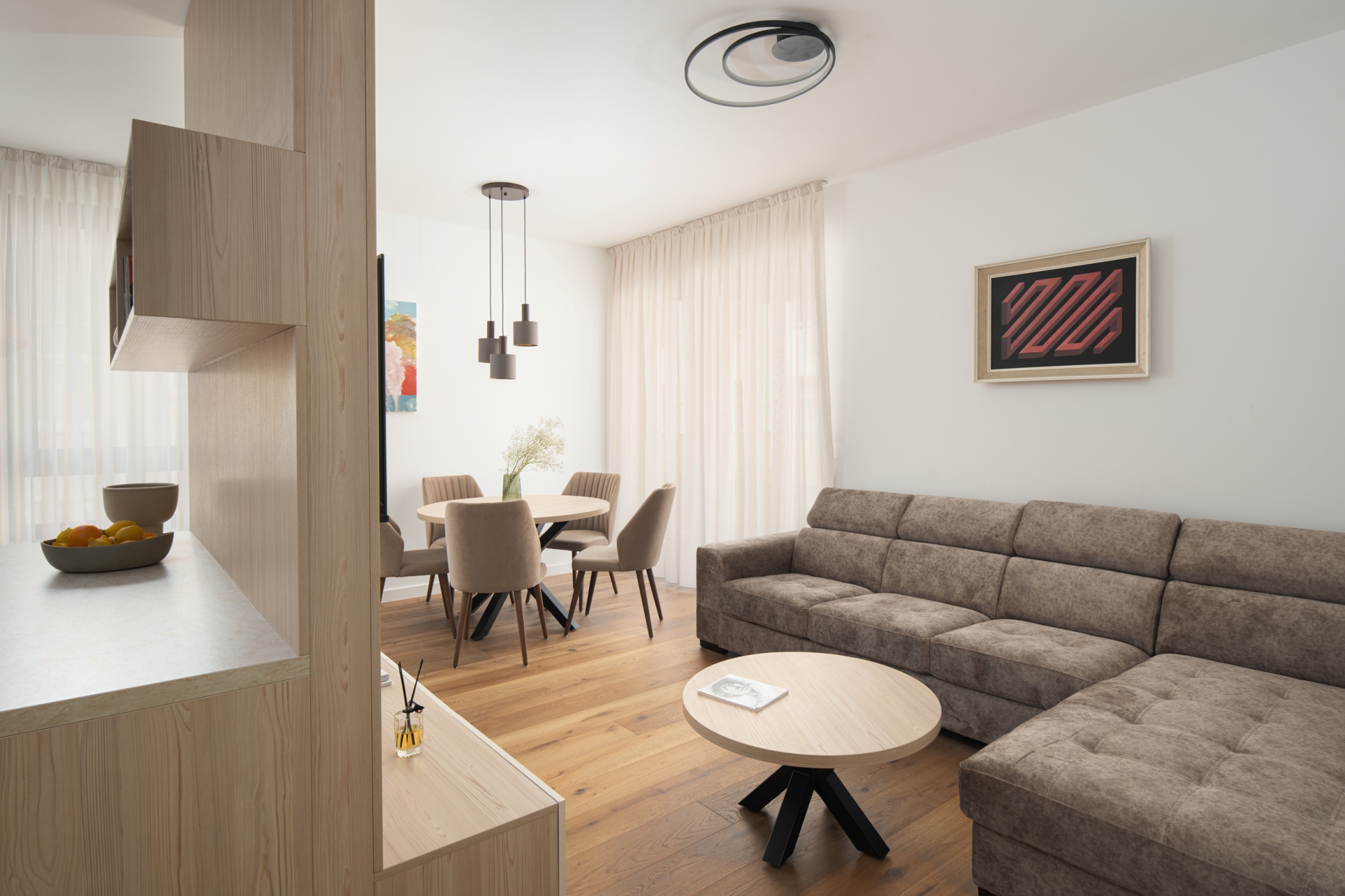 Apartman uključuje dvije udobne i moderno uređene spavaće sobe, prostrani dnevni boravak s blagovaonicom, potpuno opremljenu kuhinju, elegantnu kupaonicu s walk-in tušem, dodatni WC te balkon za opuštanje.